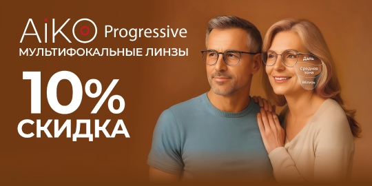 В магазинах действует скидка 10% на мультифокальные линзы AiKO Progressive — современное решение для тех, кто хочет видеть чётко вблизи, вдаль и на среднем расстоянии без смены очков.